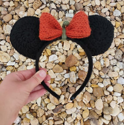 These cute mouse ears are perfect for a day in the park as well as adding a bit of child like fun to an outfit. The pumpkin bow adds a subtle but adorable fall accessory. Made with 100% acrylic yarn these mouse ears are mounted on a stander 1in. headband.