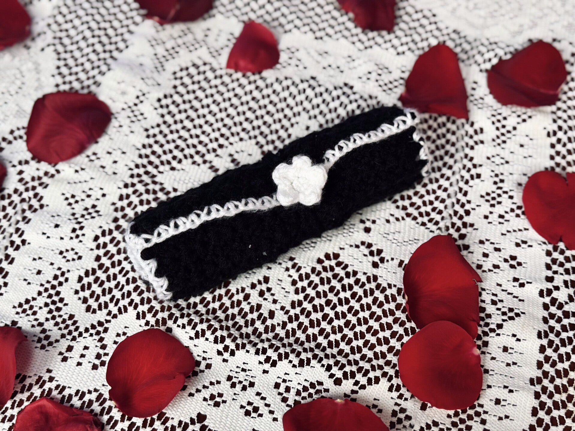 This crocheted tic-tac-toe game is handmade with 100% acrylic yarn in black and white for a classic, clean look. Designed in a convenient travel size, it rolls up neatly and secures with a flower-shaped button for easy storage. The set includes heart and flower game pieces, with attached pockets to keep them organized when not in use. A compact and functional option for on-the-go play or display.